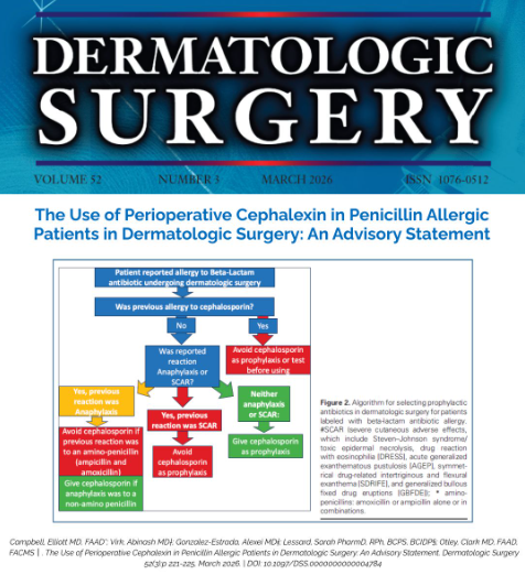 Elliot Campbell, MD, FAAD was a contributor to an article published in Dematologic Surgery (Official Journal of the American Society for Dermatologic Surgery (ASDS). The article discusses… if cephalexin should be used as a first-line prophylactic antibiotic in dermatologic surgery for patients with penicillin allergy.